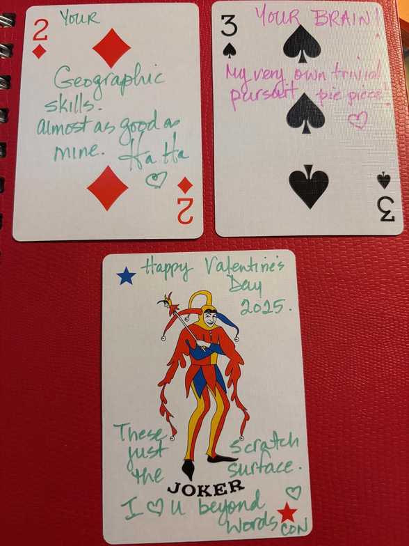 Kudos to reader, Elaine from Newfoundland, Canada, who, upon taking my suggestion for a V-Day gift last year, wrote something she appreciated about her honey on each playing card! Can you imagine doing that for yourself?!